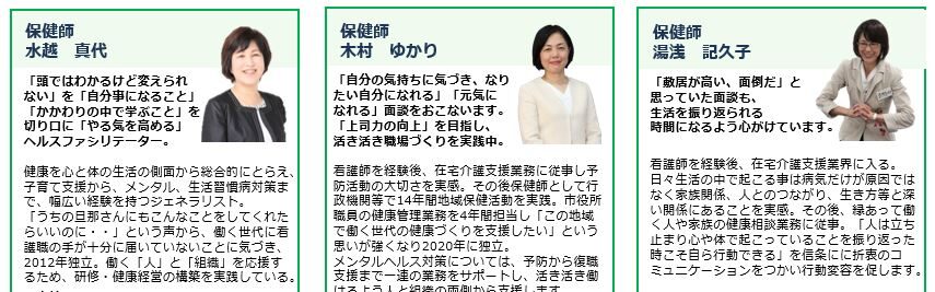 これまで、企業の健康経営・産業保健のサポートを主に一人で行ってきましたが、4月から保健師3人でチームを組み、コンテンツ開発や今後の戦略を進める活動を行っています。