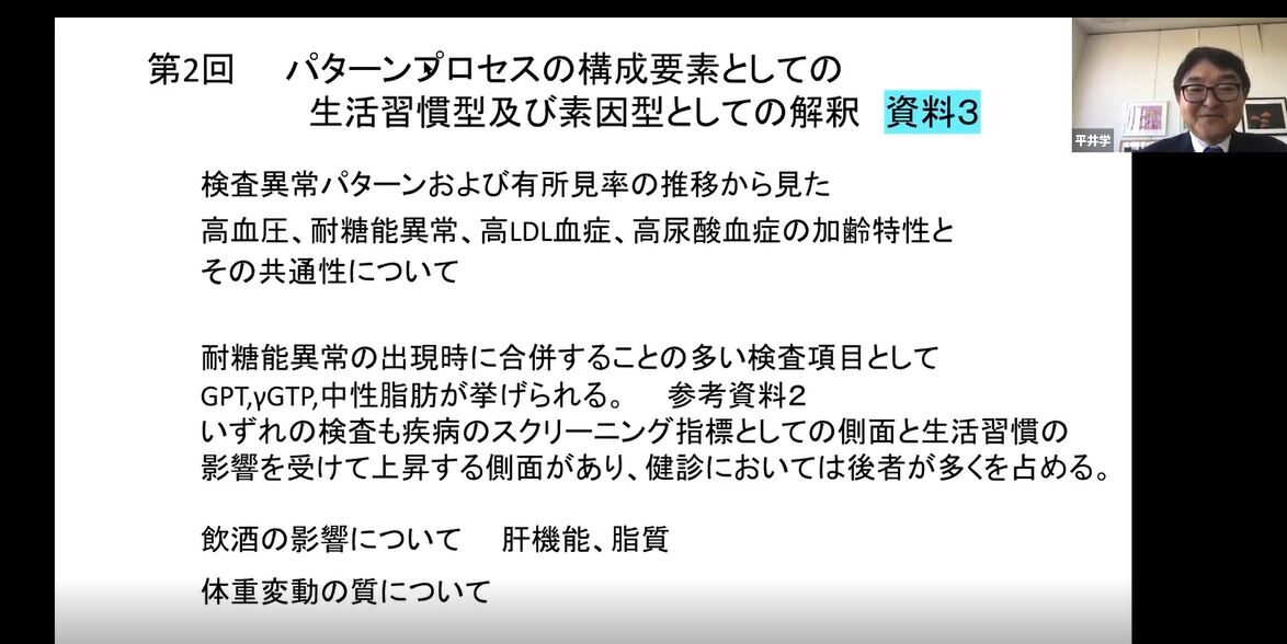 10月10日(土)から5回コースで開催している、「健診データーから個人の将来的健康予測と評価」~パターンプロセス理論に基づく目からうろこの健診結果のとらえ方~をオンラインで、(公財)高知県総合保健協会 平井学先生をお迎えして行っています。
